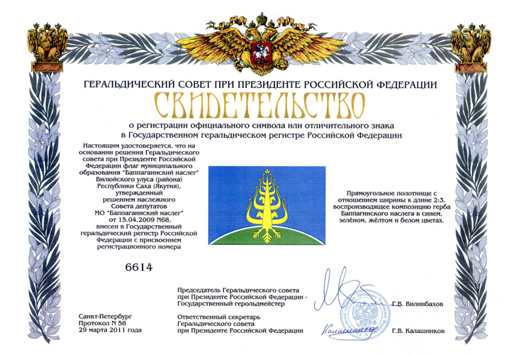 По материалам геральдического архива В.Маркова. Фото свидетельства с сайта Правительства РС(Я) - https://www.sakha.gov.ru