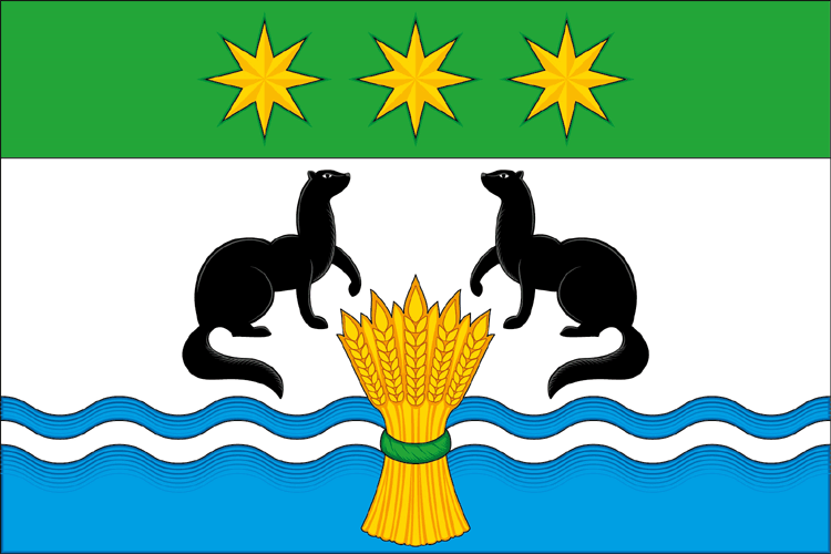Прямоугольное полотнище с отношением ширины к длине 2:3, состоящее из трех равных горизонтальных полос: верхняя полоса зеленого цвета; средняя полоса белого цвета, повторяет цвет среднего серебряного поля геральдического щита; нижняя синяя полоса отделена от белой полосы тремя волнистыми линиями (темно синей, белой и голубой). Три волнистые линии занимают 1/5 часть нижней синей геральдической полосы, или 1/15 часть всего геральдического поля флага.