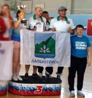 До утверждения официального флага спортсмены Дальнегорска использовали белый флаг с изображением герба. Фото прислано В. Попоски (V.Poposki) - Спартакиада МО Приморского края, 2023 г, источник фото - Министерство физ.культуры и спорта Приморского края |