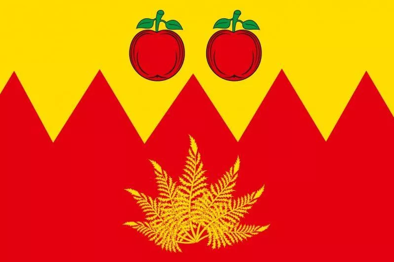 "Прямоугольное полотнище с отношением ширины к длине 2:3, разделённое по горизонтали зигзагообразно на две полосы: верхнюю жёлтую и нижнюю красную в соотношении 4:5, воспроизводящее фигуры из гербовой композиции: в центре жёлтой части два красных яблока с зелёными черенками и листками, а в центре красной части - семь жёлтых стеблей папоротника, сложенных веерообразно".