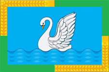 "Прямоугольное двухстороннее полотнище голубого цвета с отношением ширины к длине 2:3, окруженное со всех сторон узкой (1/10 ширины полотнища) полосой из 4-х равных чередующихся частей: из желтого колоса (начиная с середины края у древка) и зеленой. В середине полотнища плывущий по волнам воздевший крылья белый лебедь с черными глазами и переносьем и с желтым клювом".