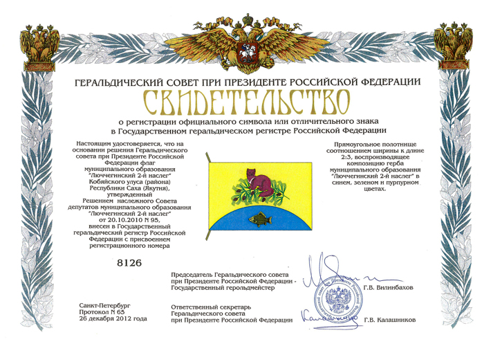 Cимволы Люччегинского 2-го наслега утверждены Решением наслежного Совета депутатов от 20 октября 2010 г. № 95. Автор флага: Матвеев Артур Матвеевич (г. Якутск). Флаг наслега внесён в Государственный геральдический регистр РФ под № 8126. Описание флага: "Прямоугольное полотнище с соотношением ширины к длине 2:3, воспроизводящее композицию герба в желтом, синем, зеленом и пурпурном цветах". Материалы геральдического архива В. Маркова. Фото свидетельства - официальный информационный портал Республики Саха |