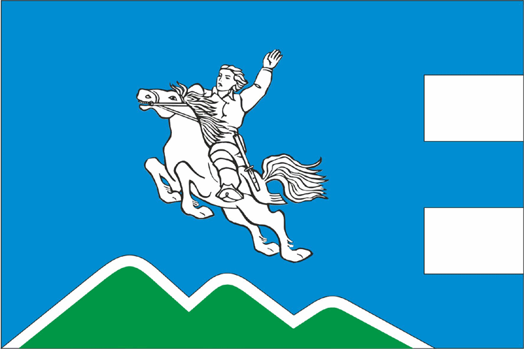 Флаг Мегино-Кангаласского района утвержден Решением улусного собрания депутатов № ПУС-25-3 от 28 апреля 2005 года. Прямоугольное полотнище с отношением ширины к длине 2:3, воспроизводящее композицию герба муниципального образования в синем, белом и зеленом цветах. "Центральная фигура флага – всадник на коне, запечатленном в прыжке вперед и вверх налево. Всадник олицетворяет образ легендарного национального героя Василия Манчары, уроженца Мегино-Кангаласской земли. Внизу под всадником – стилизованное изображение горы с тремя вершинами. Общая композиция герба является художественно-графическим отображением известной среди якутов идиомы "Мэнэлэр хайа урдугэр", что в переводе означает "Мегинцы (мегино-кангалассцы) на горе, на высоте". Автор флага и герба: Константинова Анастасия Михайловна (с. Майя). Материалы геральдического архива В. Маркова, рисунок - по "ВИКИПЕДИИ - Свободной энциклопедии" |