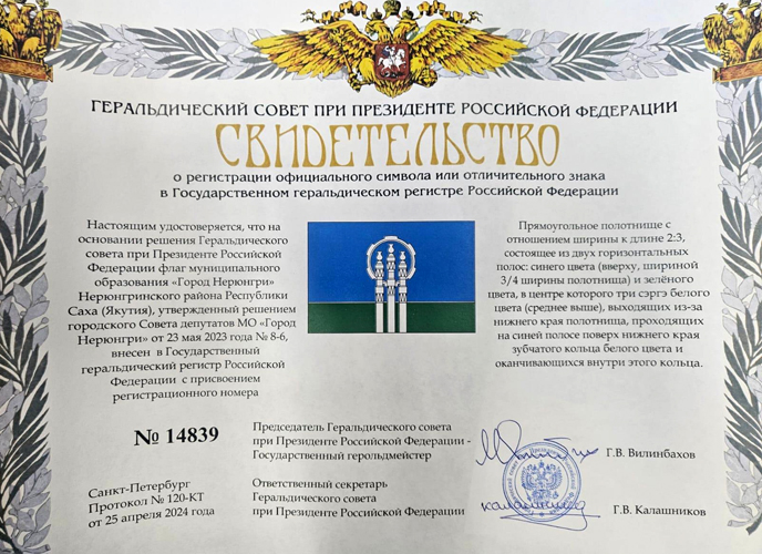 Флаг и герб города Нерюнгри утверждены решением городского Совета депутатов от 23 мая 2023 года № 8-6. Флаг внесен в Государственный геральдический регистр РФ под № 14839. Описание флага: "Прямоугольное полотнище с отношением ширины к длине 2:3, состоящее из двух горизонтальных полос: синего цвета (вверху, шириной 3/4 ширины полотнища) и зелёного цвета, в центре которого три сергэ белого цвета (среднее выше), выходящих из-за нижнего края полотнища, проходящих на синей полосе поверх нижнего края зубчатого кольца белого цвета и оканчивающихся внутри этого кольца". Геральдическое описание и обоснование символики герба города Нерюнгри