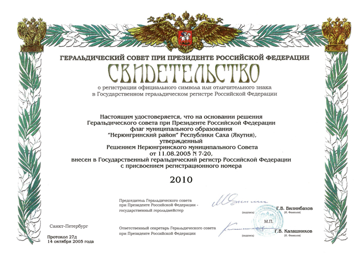 Современный флаг Нерюнгринского района утверждён Решением Нерюнгринского муниципального Совета № 7-20 от 11 августа 2005 года и в октябре 2005 года внесён в Государственный геральдический регистр РФ под № 2010. Флаг муниципального образования «Нерюнгринский район» представляет собой прямоугольное полотнище с соотношением ширины к длине 2:3, в лазоревом (синем, голубом) поле три выходящих золотых коновязи в виде резных столбов, из которых средний - выше, водруженных деревянными кубками - чоронами и сопровождаемые вверху и по сторонам пятью золотыми рыбами (хариусами), уложенными в кольцо по ходу солнца, вдоль древка флага семь серебряных якутских алмазов (фигур в виде поставленных на угол квадратов, каждый из которых расторгнут на шесть частей: накрест и наподобие двух сходящихся по сторонам стропил). Источник фото - http://www.debri-dv.ru/article/3663. Копия свидетельства - с сайта Правительства РС(Я) Город Нерюнгри составляет муниципальное образование (городское поселение) в составе Нерюнгринского района.