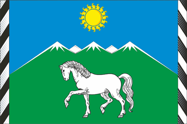 В зеленом поле в середине верстовой столб, около столба белая лощадь. Сверху на лазоревом поле пять заснеженных гор, выше которых солнце.
