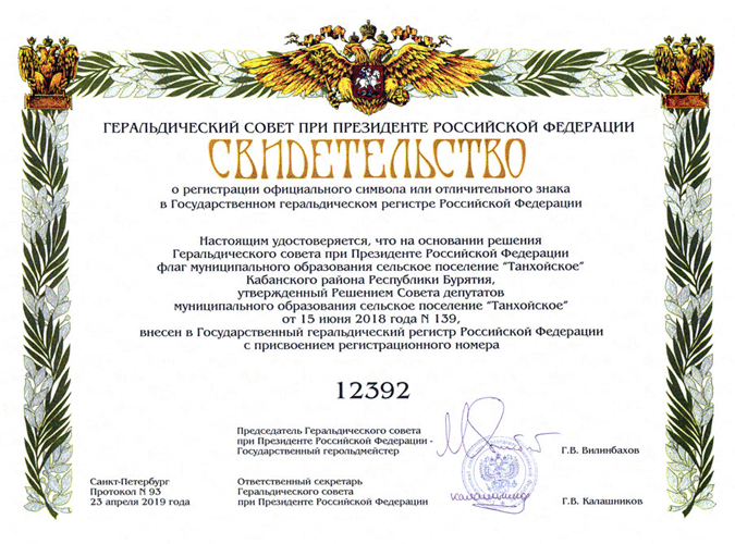 Флаг внесен в Государственный геральдический регистр РФ под № 12392. По информации А.Н. Юрасова. |