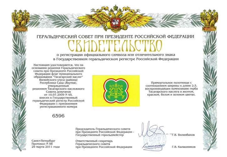Флаг Тасагарского наслега утверждён Решением Тасагарского наслежного Совета депутатов № 45 от 10 июля 2009 года. "Прямоугольное полотнище с соотношением ширины к длине 2:3, воспроизводящее композицию герба Тасагарского наслега в желтом, красном, белом и зеленом цветах". Флаг внесен в Государственный геральдический регистр РФ под № 6596. По сообщению Б.Вольфова со ссылкой на сайт правительства Якутии и В.Маркова |
